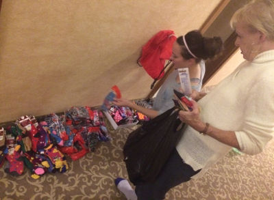 We then arrived to the hotel and began assembling bags with hygiene products, gifts and school materials to give to the refugees.